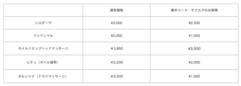 集中コース、サブスクコースの方はシロダーラやフェイシャルなどもお得に受けることが出来ます。
